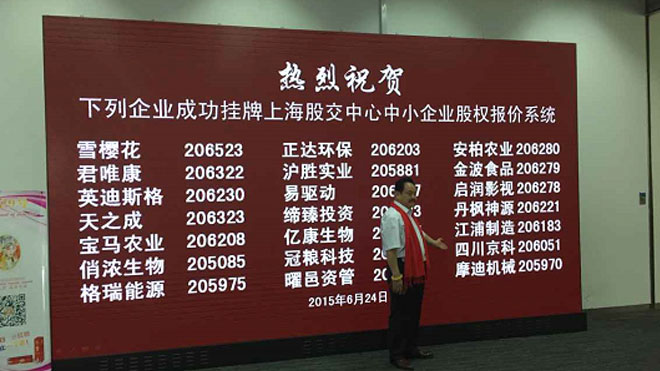 近日(2015年6月24日),随着一声响亮的锣响,四川京科兴隆实业有限责任公司在上海股权托管交易中心成功挂牌,实现与资本市场的无缝对接。 四川京科兴隆实业有限责任公司是四川省重点高科技产业,是专业从事节能、环保特种新材研究开发的企业。公司以农业废弃物秸秆等再生资源为原料,研制出了京科新型环保、零甲醛、防火、防水特种建筑装饰建材及深加工的系列产品,填补了我国建筑装饰不具多重使用性能的空白,获得科技创新一等奖,为中国的绿色环保事业掀开了新篇章。